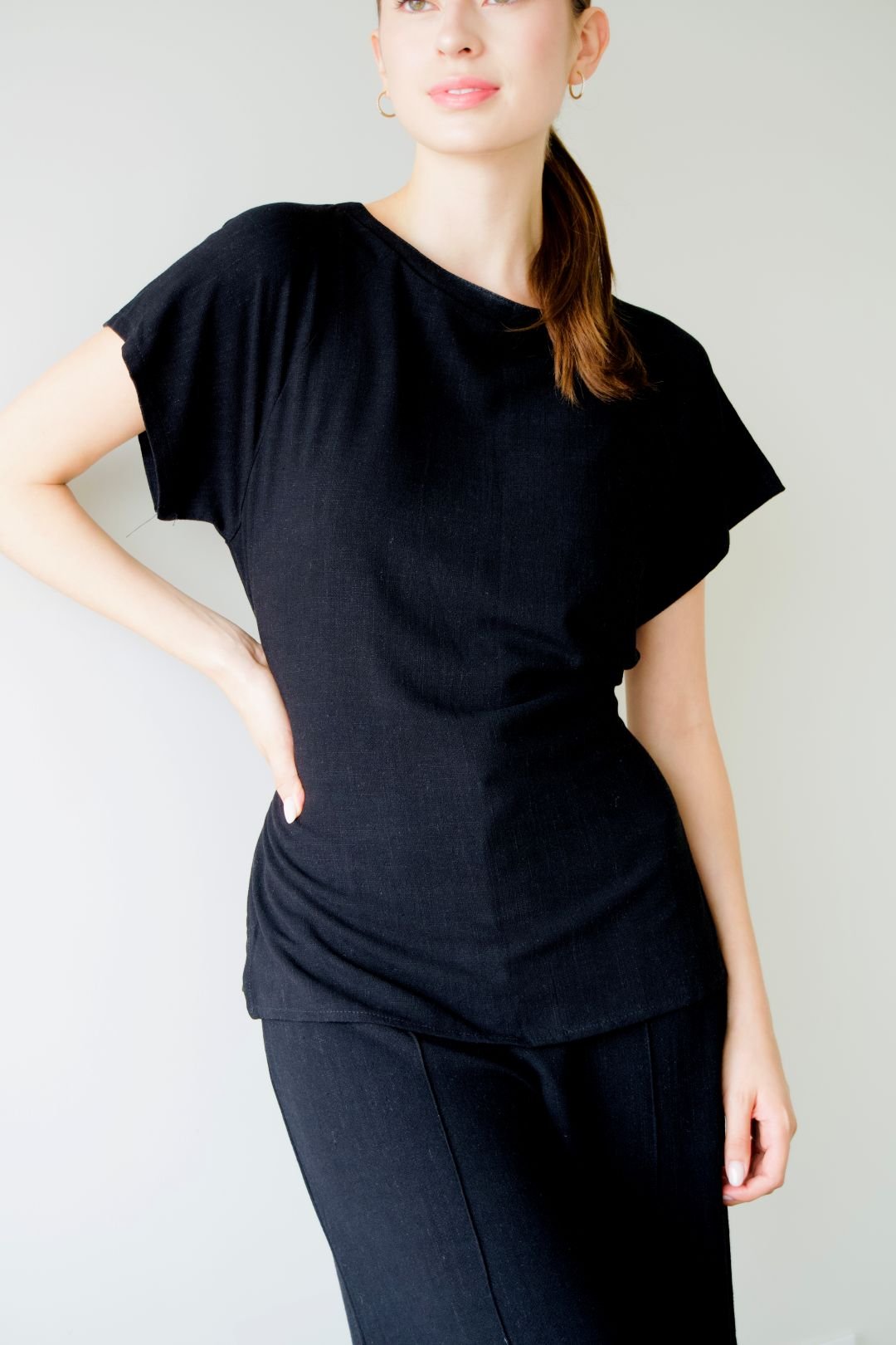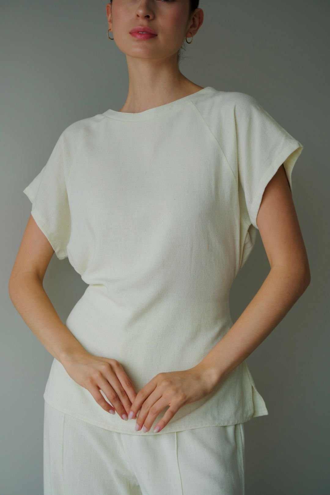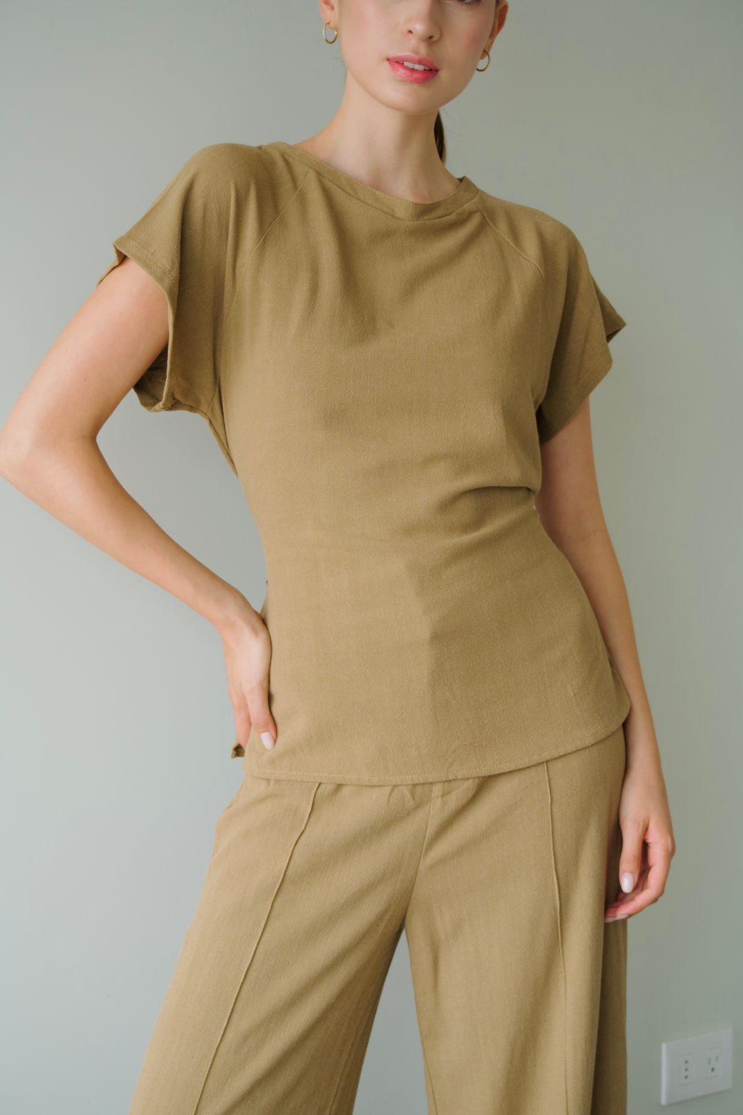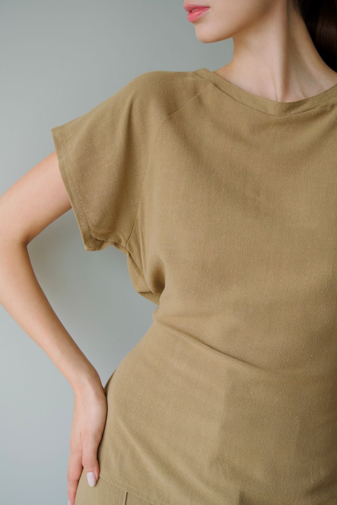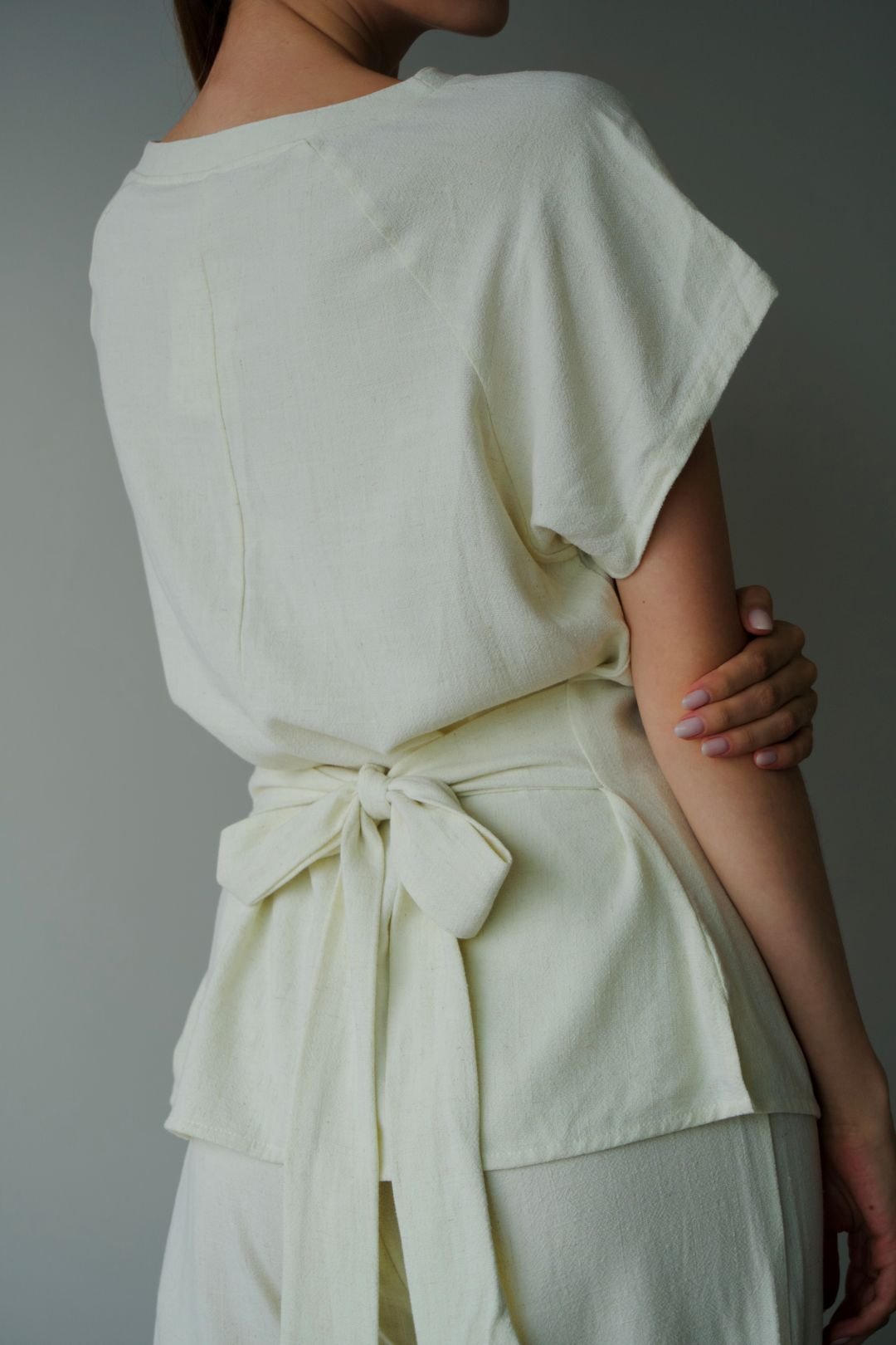 Blusa hecha con Lino Savanna. Con manga ancha y lazo en la cintura para dar silueta.