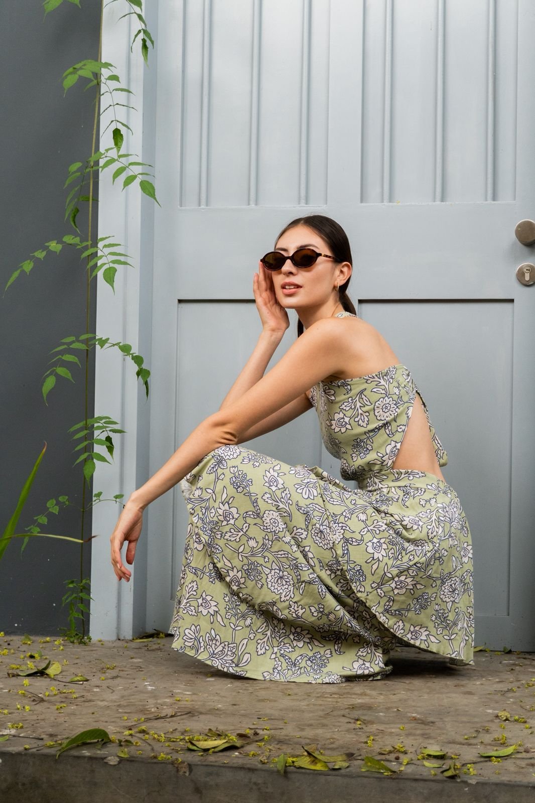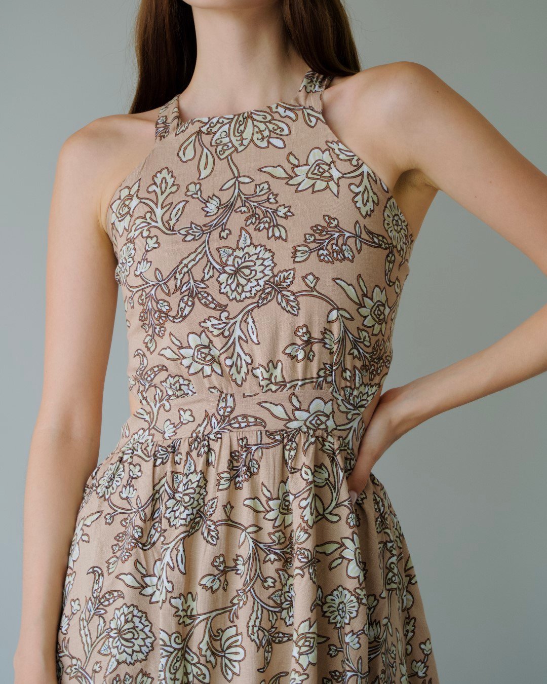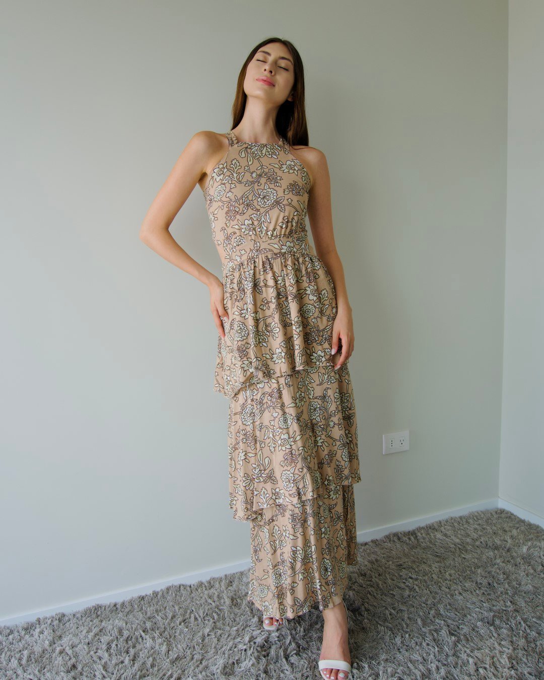 Maxi vestido largo confeccionado en tela ligera, con escote y cuello halter cerrado en la parte delantera. Falda en tres tiempos.