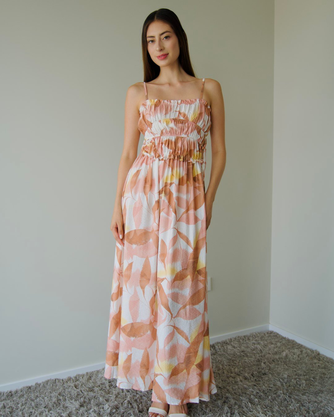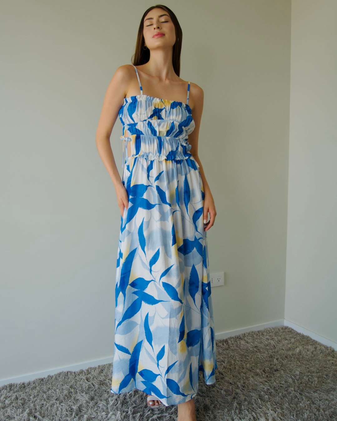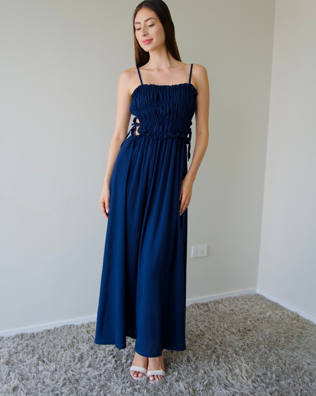 Maxi vestido de tirantes y escote recto con paneles estaticos, aberturas laterales con lazos ajustables, falda con caida fluida.
