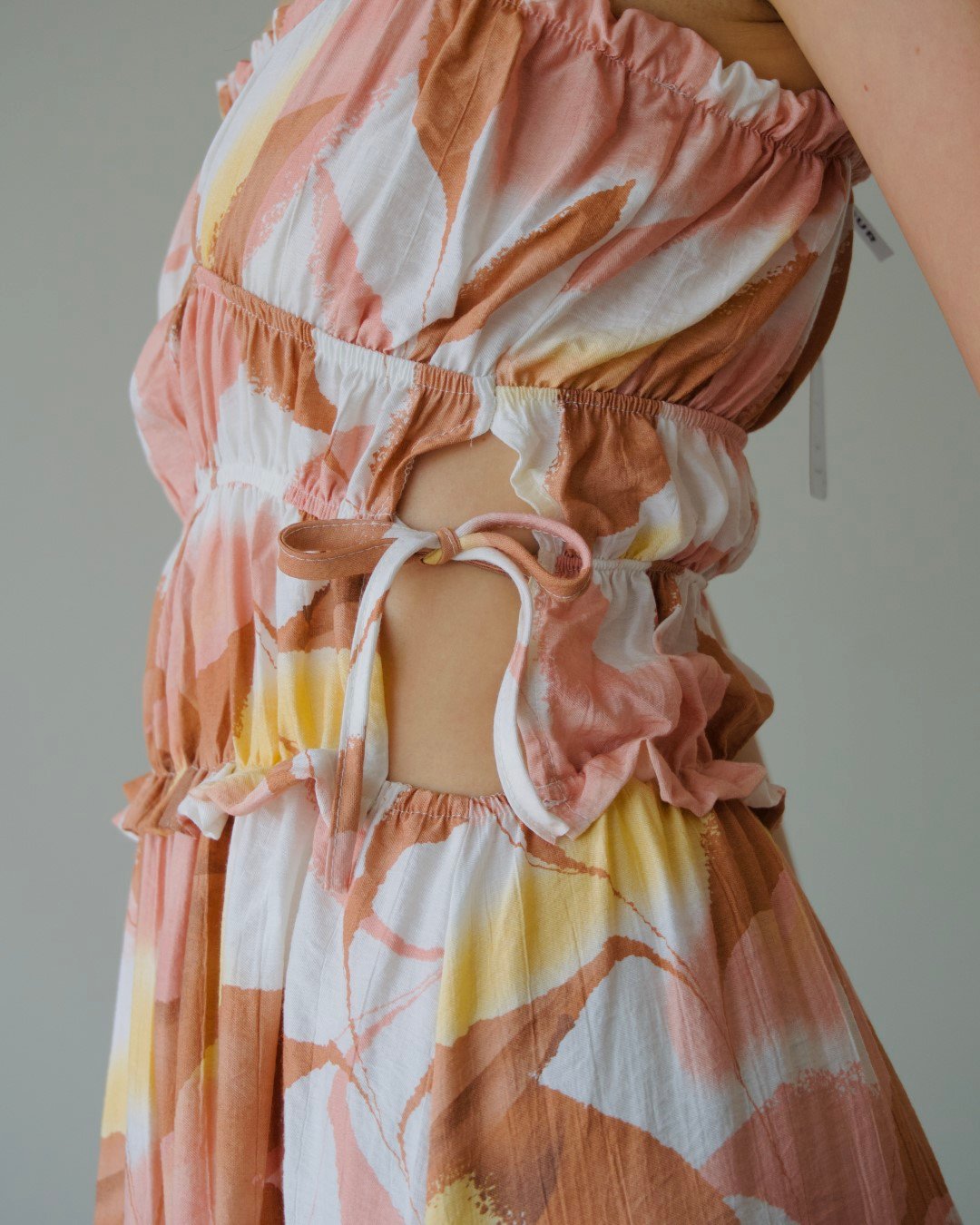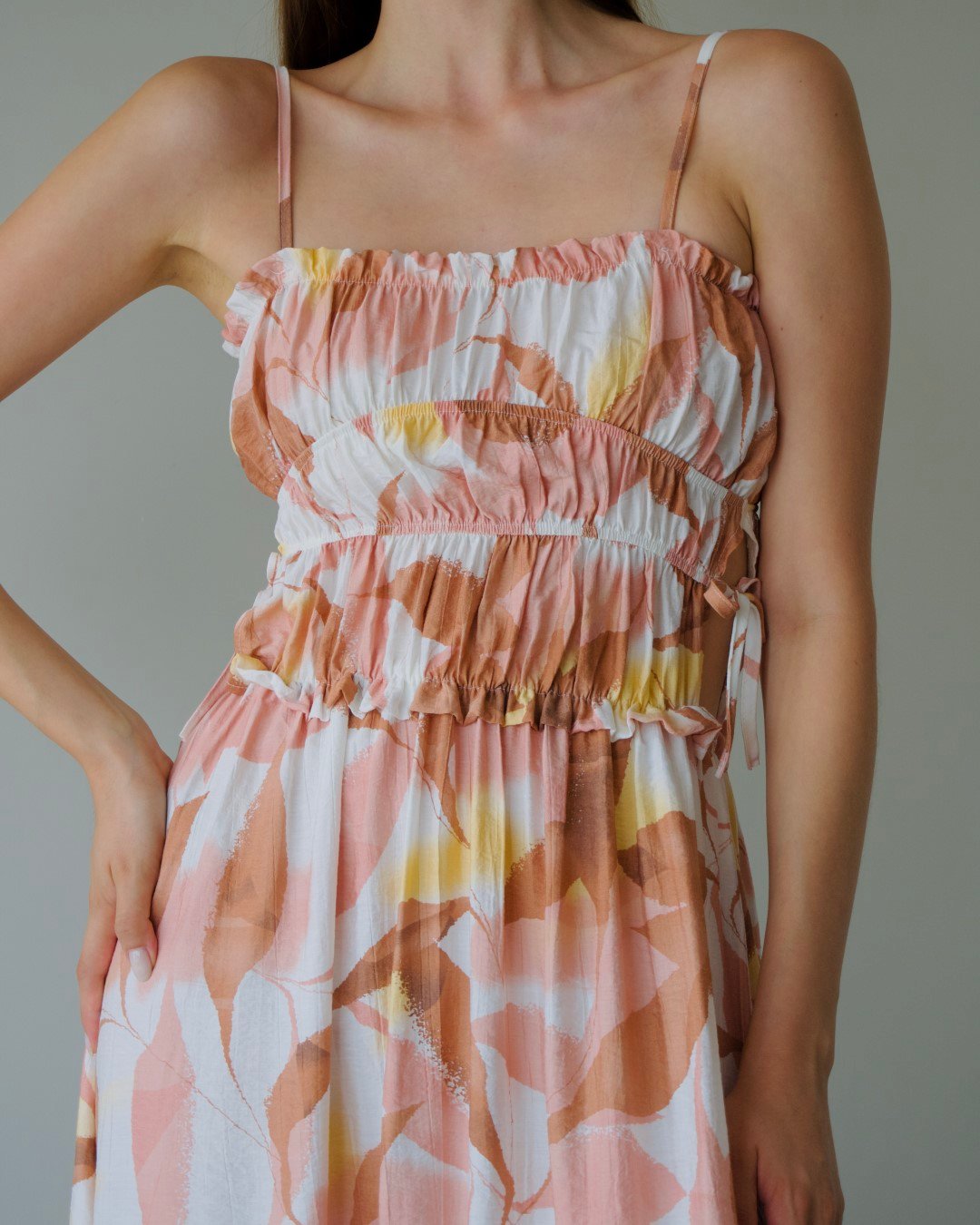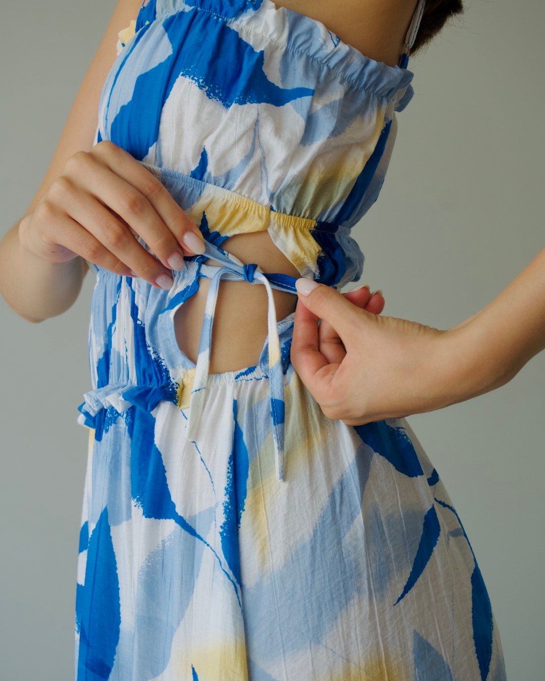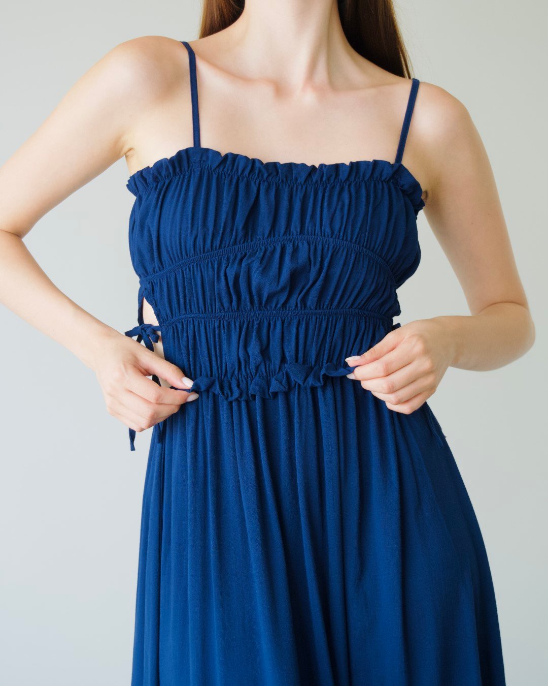Maxi vestido de tirantes y escote recto con paneles estaticos, aberturas laterales con lazos ajustables, falda con caida fluida.