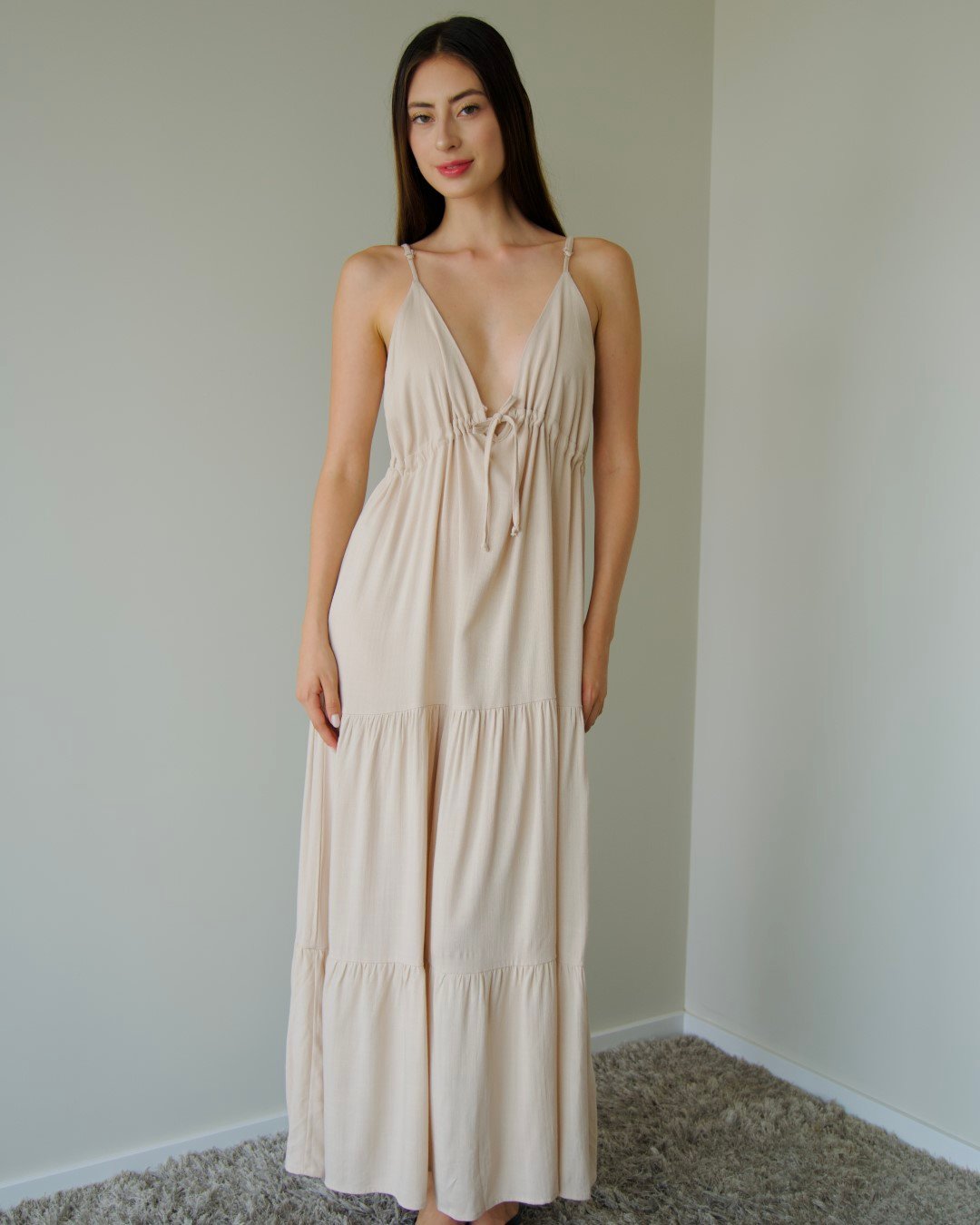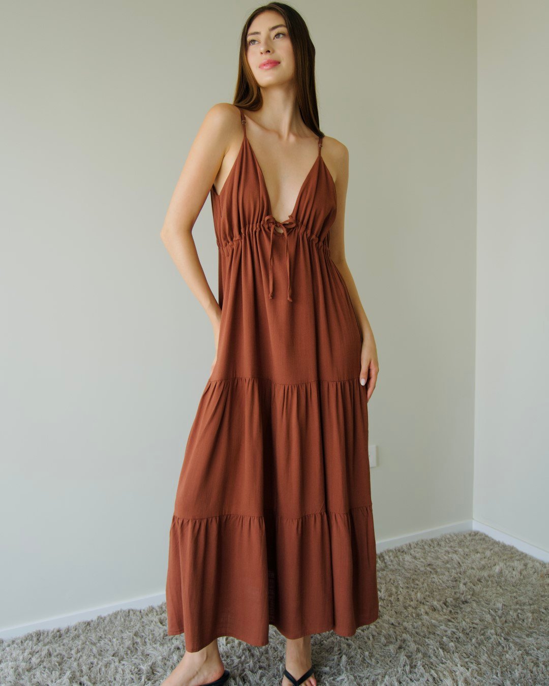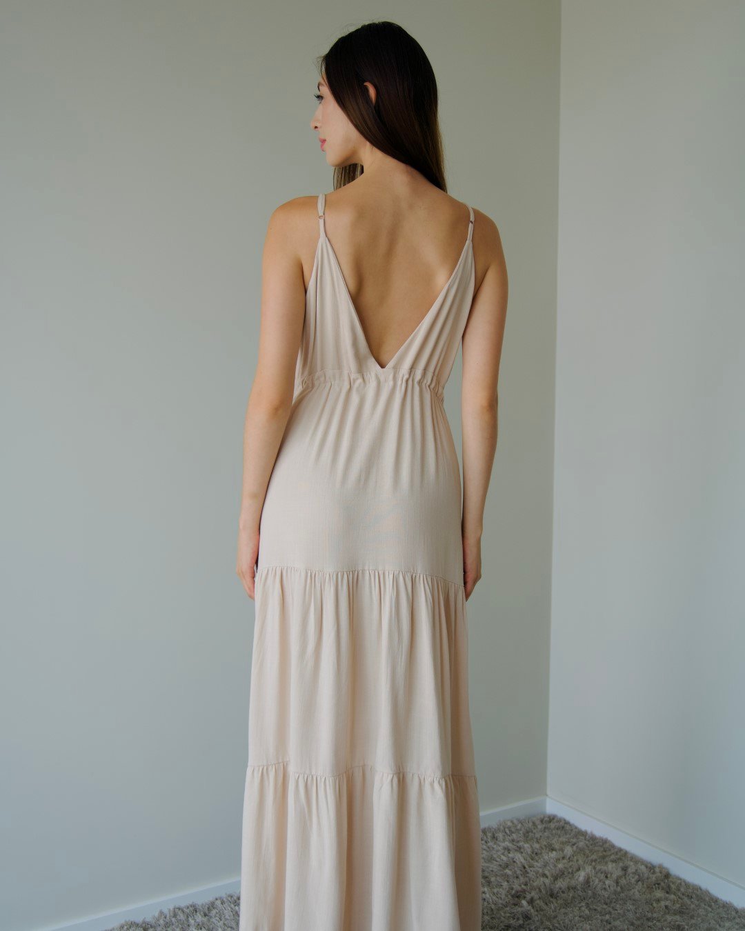 Maxi vestido con escote en el pecho y espalda, tiras regulables y ajuste en el pecho.