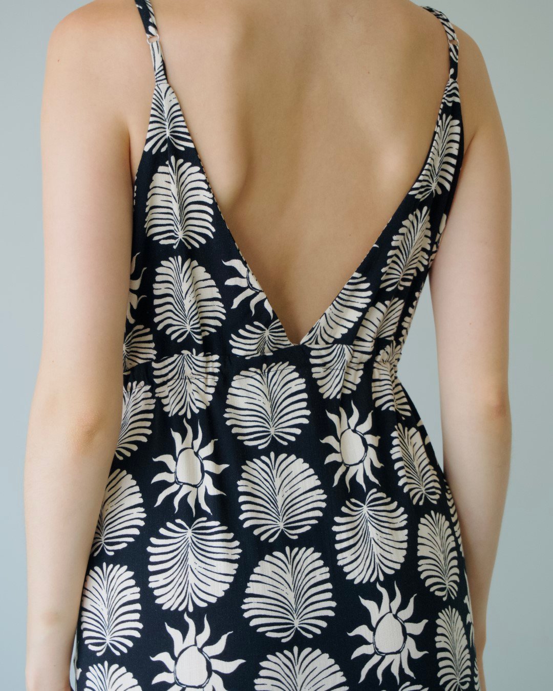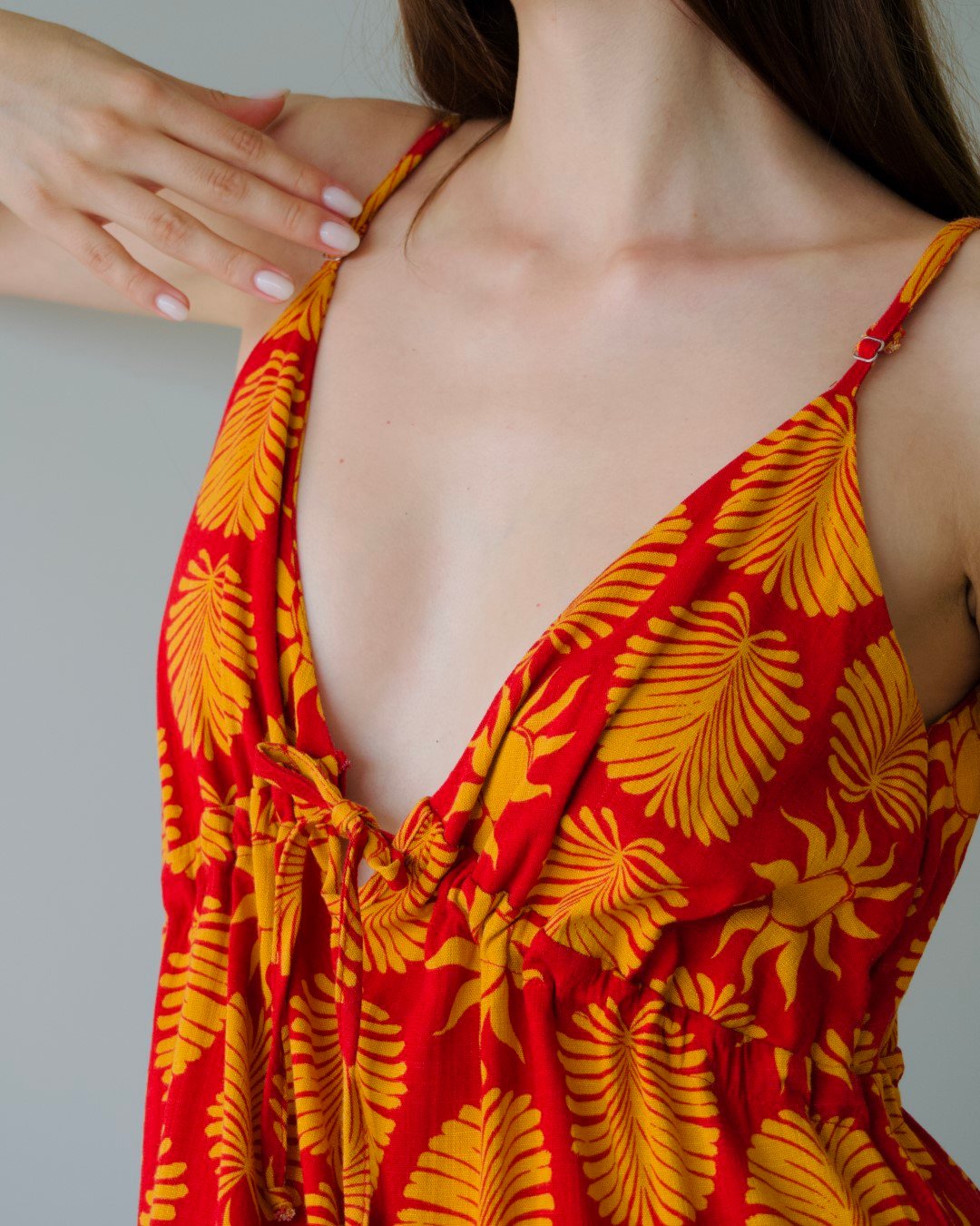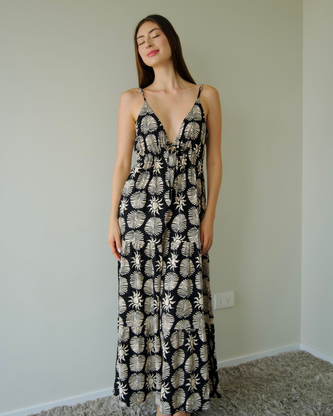Maxi vestido con escote en el pecho y espalda, tiras regulables y ajuste en el pecho.